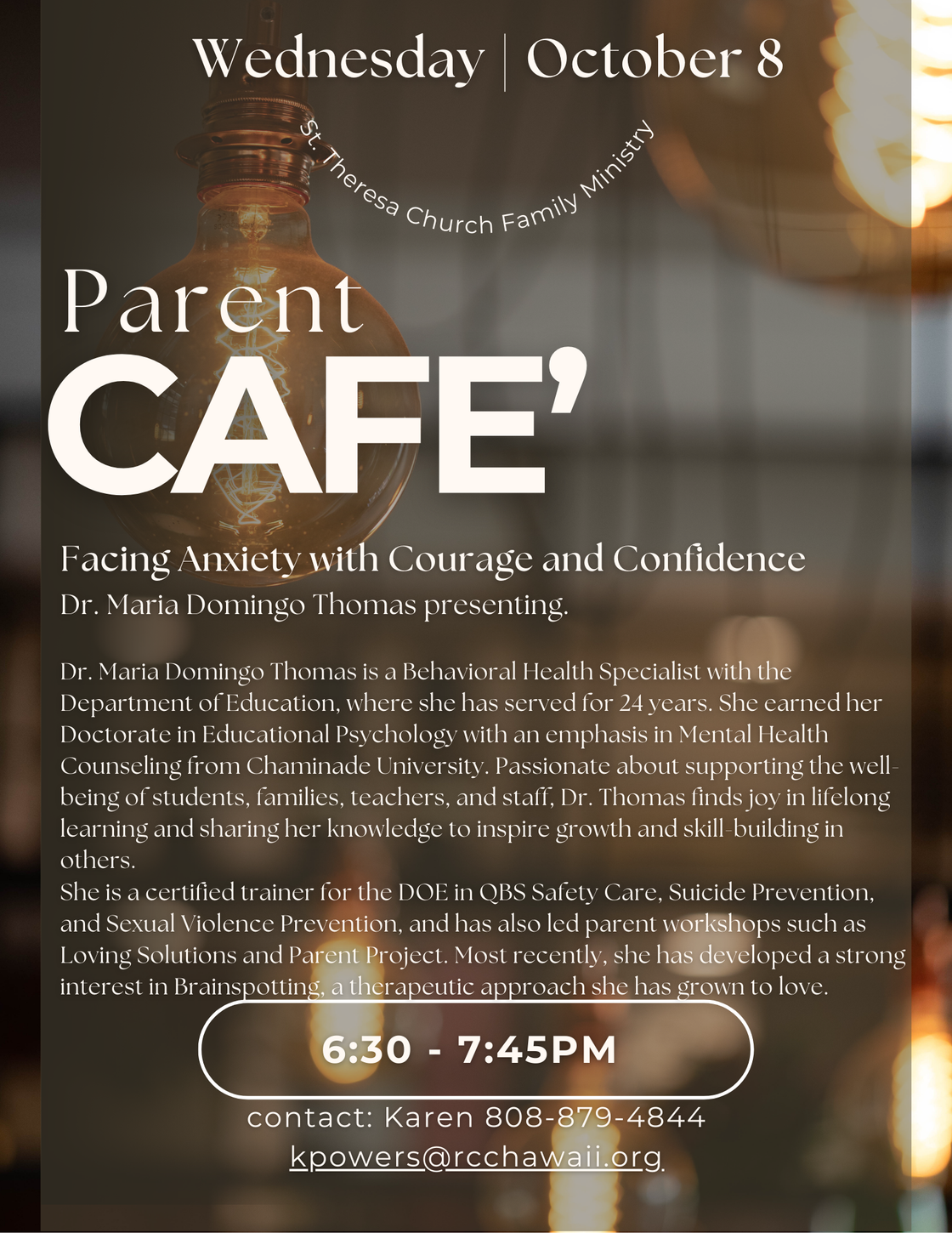 St. Theresa, a Catholic community in Kihei, called to be disciples of Jesus, seeks to: faithfully model Jesus according to His work; become a welcoming, loving and caring community; grow in our faith and spirituality through Eucharist, the sacraments, prayer and study; put faith into action through full and active participation in our parish and community; practice stewardship in our parish and community.