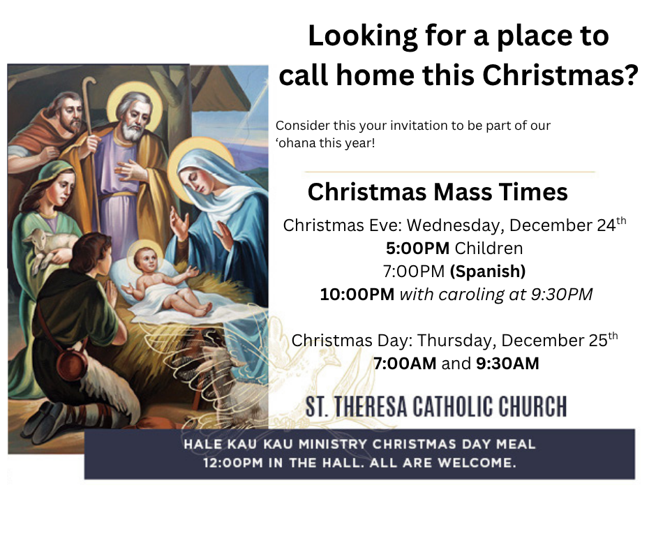 St. Theresa, a Catholic community in Kihei, called to be disciples of Jesus, seeks to: faithfully model Jesus according to His work; become a welcoming, loving and caring community; grow in our faith and spirituality through Eucharist, the sacraments, prayer and study; put faith into action through full and active participation in our parish and community; practice stewardship in our parish and community.